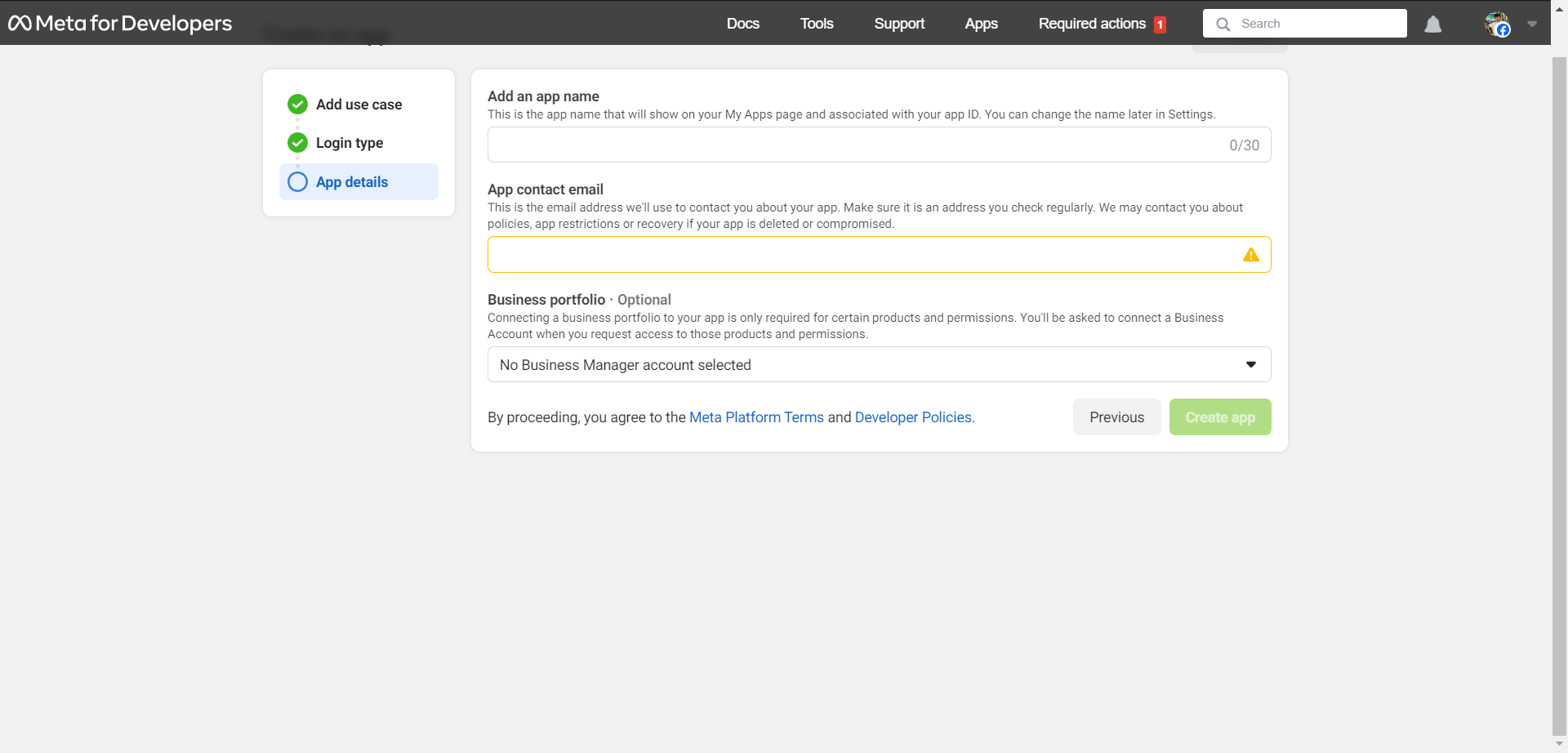 In the next screen, set App permissions to Read. Set Type of App to Web app. Copy Callback URL and paste it to the App info section.