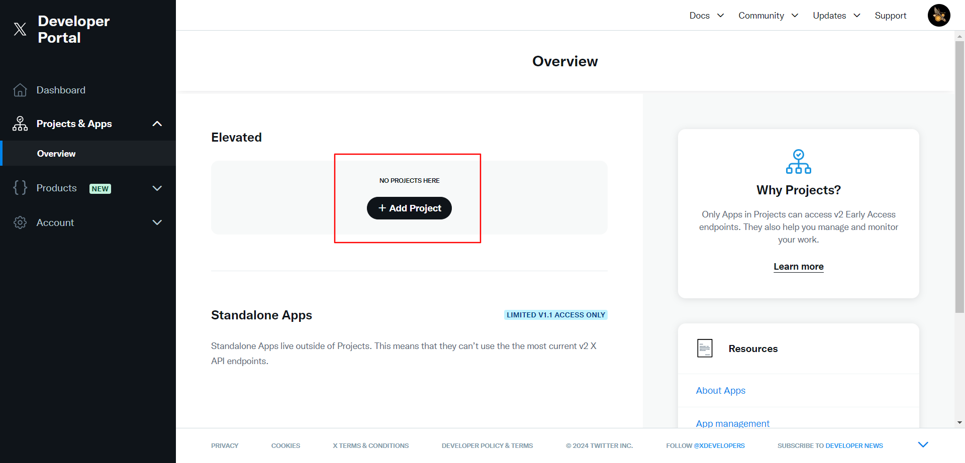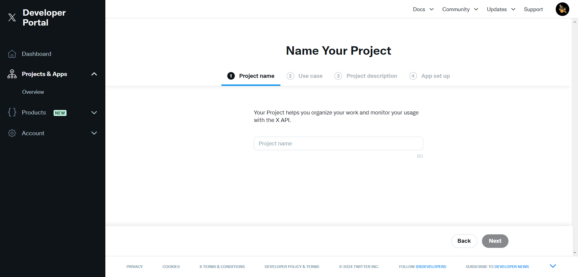 https://developer.twitter.com/en/portal/projects-and-appsThen fill out all the information,